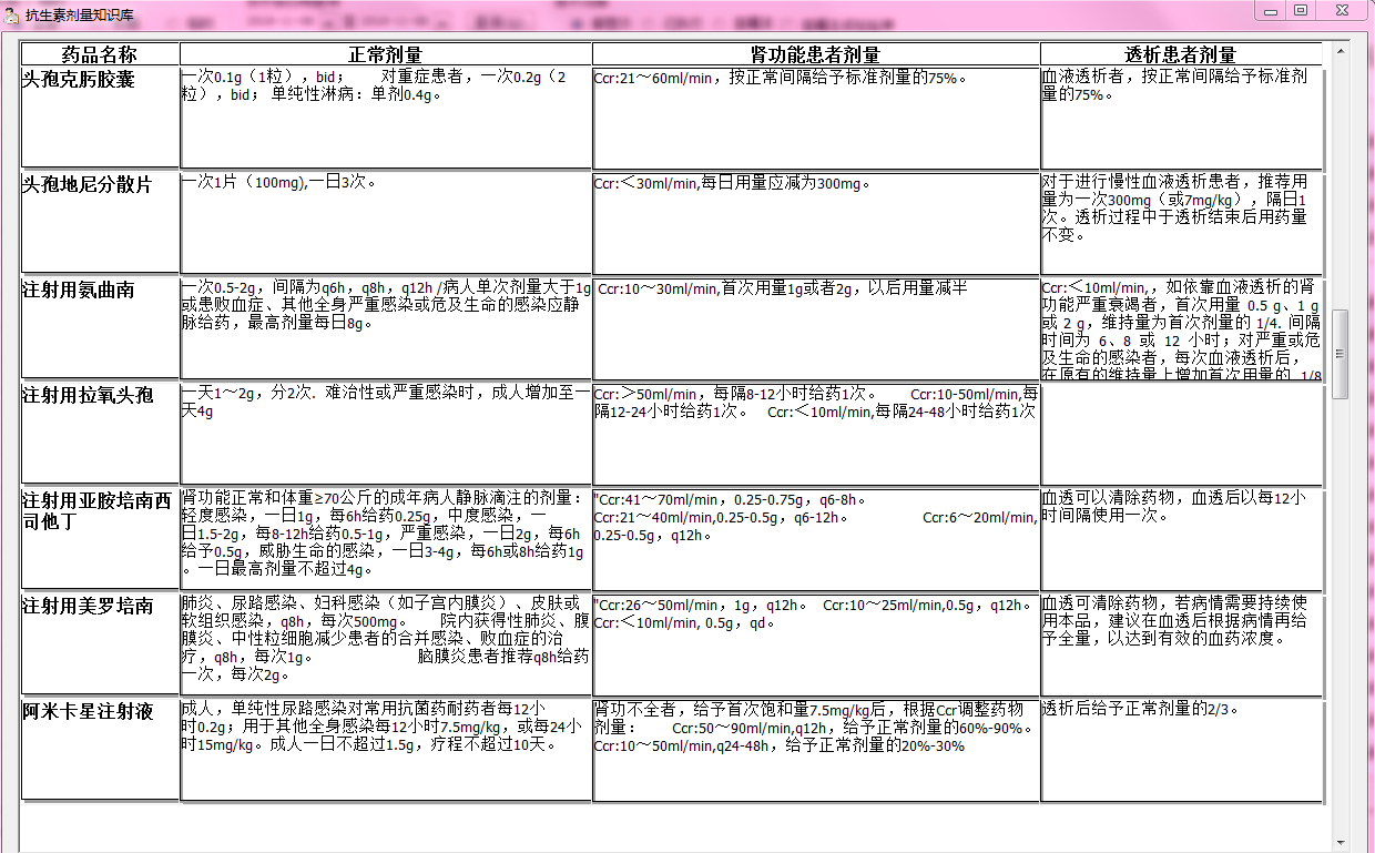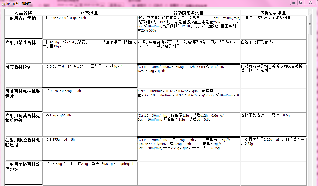 为了方便医生查询,促进青海红十字医院对肾功能不全患者抗菌药物合理使用及个体化给药方案应用,我院药学部临床药学室按照《2018年青海红十字医院抗菌药物备案表》目录,制作了青海红十字医院肾功能不全抗菌药物剂量调整一览表,在信息科大力支持与配合下,将此表嵌入到我院医生工作站开具医嘱页面中。我院医生在开具医嘱过程中可进入该系统进行针对肾功能不全患者抗菌药物使用剂量查询,如医生在使用过程中有任何疑问,可致电药学部临床药学室(张启慧18997286013)。