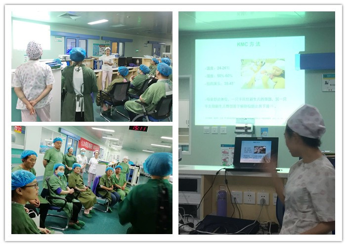 今天我们看到了她们的脸上难以掩饰的激动。当我们把宝宝抱到她们(他们)面前时妈妈满脸温柔的看着自己怀里的宝宝,如同在看一件稀世珍宝;爸爸们无限宠溺而又忐忑的抱着宝宝脸上洋溢着初为人父的幸福;宝宝则安静的趴在爸爸妈妈的怀里,感受着爸爸妈妈的爱与温暖,不时的还咧嘴微笑呢! 在这个安静的环境里,宝宝仿佛听到了妈妈的声音,听到了熟悉的心跳声,好像又回到了之前住的那个温暖的房子里,满足而安静!爸爸妈妈们嘴角始终挂着浅浅的微笑。护理结束的时候,爸爸妈妈依依不舍,作为护士的我们也切实感受到了“母乳喂养和袋鼠式护理”对宝宝和家人带来的影响!